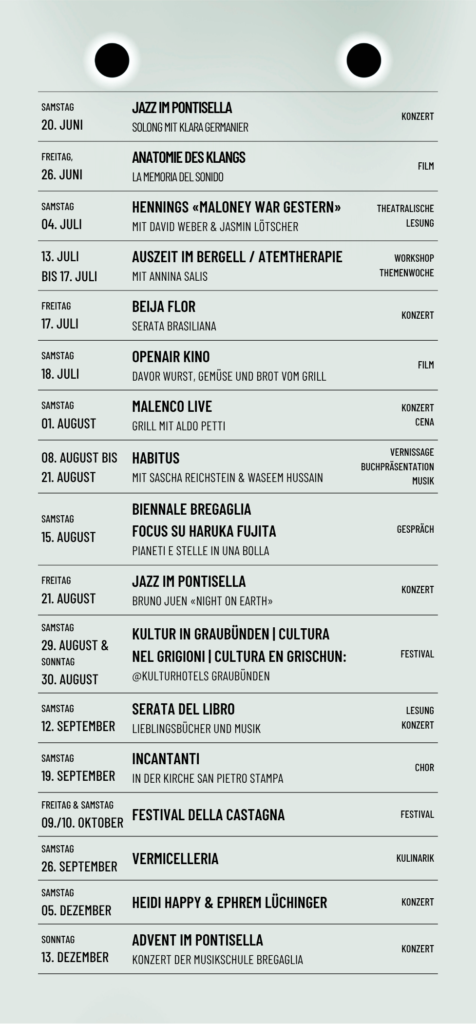 Vier Tage für Körper, Seele und Geist – mit Meditationen, Atemübungen und praxisnahen Workshops zu Resilienz, Selbstfürsorge und Lebensfreude. Eingebettet in die stille Weite des Bergells, im KulturGasthaus Pontisella.